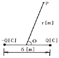 그림과 같은 전기 쌍극자에서 P점의 전계의 세기는 몇[V/m]인가?