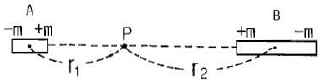 [전기자기학] 두 개의 소자석 A, B의 세기가 서로 같고 길이의 비는 1:2 이다. 그림과 같이 두 자석을 일직선상에 놓고 그 사이에 A, B의 중심으로부터 r1, r2 거리에 있는 점 P에 작은 자침을 놓았을 때 자침이 자석의 영향을 받지 않았다고 한다. r1 : r2는 얼마인가?