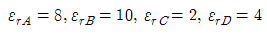 커패시터를 제조하는데 A, B, C, D와 같은 4가지의 유전재료가 있다. 커패시터 내의 전계를 일정하게 하였을 때, 단위 체적당 가장 큰 에너지 밀도를 나타내는 재료부터 순서대로 나열한 것은? (단, 유전재료 A, B, C, D의 비유전율은 각각
