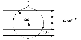 그림과 같이 반지름 a[m]의 한번 감긴 원형코일이 균일한 자속밀도 B[Wb/m2]인 자계에 놓여 있다. 지금 코일 면을 자계와 나란하게 전류 I[A]를 흘리면 원형코일이 자계로부터 받는 회전 모멘트는 몇 Nm/rad 인가?