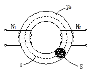 그림과 같이 단면적 S=10cm2, 자로의 길이 l=20π㎝, 비투자율 ㎲=1000인 철심에 N1=N2=100인 두 코일을 감았다. 두 코일사이의 상호인덕턴스는 몇 mH 인가?