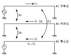그림과 같이 전력선과 통신선 사이에 차폐선을 설치하였다. 이 경우에 통신선의 차폐계수(K)를 구하는 관계식은? 단, 차폐선을 통신선에 근접하여 설치한다.