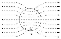 [전기자기학] 평등 전계 중에 유전체 구에 의한 전속 분포가 그림과 같이 되었을 때 ε1과 ε2의 크기 관계는?