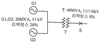 그림과 같은 송전계통에서 S점에 3상 단락사고가 발생했을 때 단락전류(A)는 약 얼마인가? (단, 선로의 길이와 리액턴스는 각각 50㎞, 0.6Ω/㎞이다.)