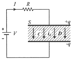 그림은 커패시터의 유전체 내에 흐르는 변위전류를 보여준다. 커패시터의 전극 면적을 S(m2), 전극에 축적된 전하를 q(C), 전극의 표면전하 밀도를 σ(C/m2), 전극 사이의 전속밀도를 D(C/m2)라 하면 변위전류밀도 id(A/m2)는?