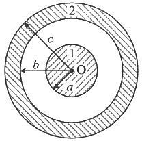 그림과 같이 점 O를 중심으로 반지름이 a(m)인 구도체 1과 안쪽 반지름이 b(m)이고 바깥쪽 반지름이 C(m)인 구도체 2가 있다. 이 도체계에서 전위계수 P11(1/F)에 해당하는 것은?