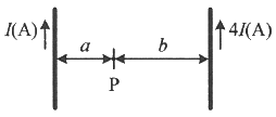 그림과 같이 평행한 무한장 직선의 두 도선에 I(A), 4I(A)인 전류가 각각 흐른다. 두 도선 사이 점 P에서의 자계의 세기가 0 이라면 a/b 는?
