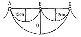 그림과 같이 지지점 A, B, C에는 고저차가 없으며, 경간 AB와 BC 사이에 전선이 가설되어 그 이도가 각각 12cm 이다. 지지점 B에서 전선이 떨어져 전선의 이도가 D로 되었다면 D의 길이(cm)는? (단, 지지점 B는 A와 C의 중점이며 지지점 B에서 전선이 떨어지기 전, 후의 길이는 같다.)