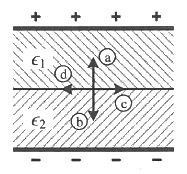 평행 극판 사이에 유전율이 각각 ε1, ε2 인 유전체를 그림과 같이 채우고, 극판 사이에 일정한 전압을 걸었을 때 두 유전체 사이에 작용하는 힘은? (단, ε1 > ε2)
