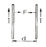 그림과 같이 진공 중에 d[m] 떨어진 두 평행 도선에 I[A]의 전류가 흐를 때 도선의 단위길이당 작용하는 힘 F[N/m] 는?