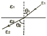 유전율이 각각 ε1=1, ε2=√3 인 두 유전체가 그림과 같이 접해있는 경우, 경계면에서 전기력선의 입사각 θ1=45°이었다. 굴절각 θ2는 몇 도인가?