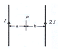 [전기자기학] 그림과 같이 평행한 두 개의 무한 직선 도선에 전류 I, 2I인 전류가 흐른다. 두 도선 사이의 점 P에서 자계의 세기가 0이다. 이때 a/b는?