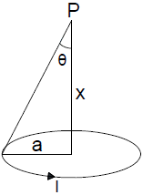 그림과 같은 반지름 a[m]인 원형 코일에 I[A]의 전류가 흐르고 있다. 이 도체 중심축상 x[m]인 P점의 자위는 몇A 인가?