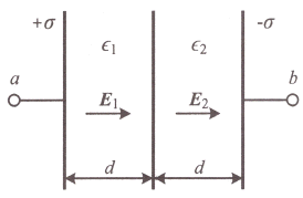 [전기자기학] 그림과 같이 극판의 면적이 S(m2)인 평행판 커패시터에 유전율이 각각 ɛ1=4, ɛ2=2인 유전체를 채우고 a, b 양단에 V(V) 의 전압을 인가했을 때 ɛ1, ɛ2인 유전체 내부의 전계의 세기 E1과 E2의 관계식은? (단, σ(C/m2)는 면전하밀도이다.)