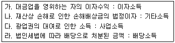 "가, 나"는 소득세법상 구분이 아닌 지출의 구분이다. "나, 다"는 소득세법상 구분이 아닌 부가가치세법상 구분이다. "나, 라"는 소득세법상 구분으로, 일반소득과 기타소득으로 구분된다. "다, 라"는 소득세법상 구분이 아닌 법인세법상 구분이다.
