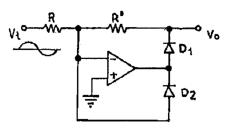 그림과 같은 회로의 입력에 정현파 신호가 인가되는 경우 연산증폭기를 포함한 전체 회로는 무슨 회로로서 동작하는가?