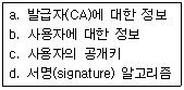 전자결제를 위한 전자인증서(digital certificate)의 구성 요소로만 묶여진 것은?