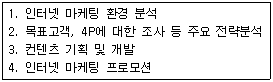 다음 제시된 내용을 인터넷 마케팅 전략수립을 위한 전개단계로 바르게 나열한 것은?