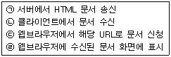 1. 클라이언트(사용자)가 웹 브라우저를 통해 서버에 html 문서를 요청한다. (ㄷ)