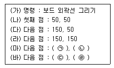 보드 외곽선은 시계방향으로 그려졌으므로, ㉠은 X좌표가 50, ㉡은 Y좌표가 150, ㉢은 X좌표가 50, ㉣은 Y좌표가 50이 된다. 따라서 정답은 "㉠ 50, ㉡ 150, ㉢ 50, ㉣ 50"이다.