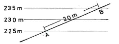 다음 그림에서 해발표고 225m와 235m의 두 지점 A~B사이는 몇[%] 경사 지역인가? (단, AB사이의 거리는 지표상의 거리임)