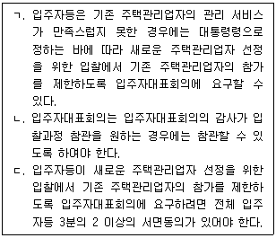 - "ㄴ" 항목은 입주자대표회의가 주택관리업자를 선정하는 방식에 관한 설명입니다. 이 항목에서는 다음과 같은 내용이 언급됩니다.