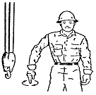 크레인의 훅을 내리는 신호입니다. 그림에서 훅이 아래로 내려가는 모습을 보이고 있기 때문입니다.