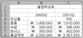 아래 워크시트에서 2001년도 총급여액을 ₩2,500,000으로 맞추기 위해 인상율을 얼마로 조절해야 하는지를 구하는 목표값 찾기 대화상자의 셀 지정으로 알맞은 것은?