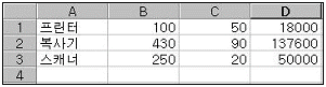 다음 워크시트에서 [D4] 셀에 수식 =VLOOKUP("복사기", A1:D3, 3, FALSE)을 입력했을 때의 결과 값으로 올바른 것은?