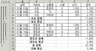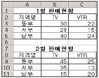 다음 중 아래의 워크시트에서 ‘1월 판매현황’과 ‘2월 판매현황’의 데이터에 대해서 지역명 별로 TV, VTR의 평균 또는 합계에 대한 월별 집계를 구하기에 가장 적절한 [데이터] 메뉴의 기능으로 옳은 것은?