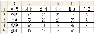 아래 워크시트에서 [F2] 셀에 IF 함수를 이용하여 합계가 90 이상이면 “A”로 표시하고, 80 이상이면 “B”로 표시하고, 나머지의 경우에는 “F”로 표시하고 [F5] 셀까지 채우려고 한다. [F2] 셀에 들어갈 수식으로 옳은 것은?