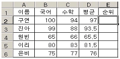 아래 워크시트에서 평균에 대한 내림차순 순위를 구하고자 한다. [E2] 셀에 함수식을 입력한 후 채우기 핸들을 이용하여 [E3:E6] 셀에 복사하려고 할 때 입력해야 할 함수식으로 옳은 것은?