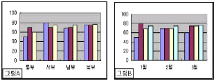 <그림A>의 차트를 월별 대리점 판매현황에 대한 비교를 용이하게 하기 위하여 <그림B>와 같은 차트로 변경하려고 할 때 이용되는 차트의 메뉴로 옳은 것은?