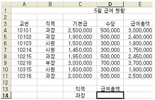 직책이 ‘과장’인 직원의 ‘급여총액’을 구하려고 한다. 다음 중 [D14] 셀에 들어갈 함수식으로 옳은 것은?