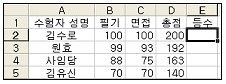 [스프레드시트 일반] 아래의 워크시트에서 총점에 대하여 내림차순으로 ‘김수로’의 등수를 산출하고, 채우기 핸들을 이용하여 등수를 표시하려고 할 때 올바른 수식은?