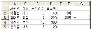 [스프레드시트 일반] 아래 시트에서 직위가 ‘대리’인 직원의 ‘월급여’ 합계를 구하려고 할 때 [G3] 셀에 입력할 수식으로 올바른 것은?
