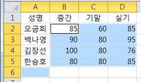 [스프레드시트 일반] 아래의 워크시트에서 [B2:D5] 영역은 ‘점수’로 이름이 정의되어 있다. 다음 중 [A6] 셀에 수식 ‘=AVERAGE(INDEX(점수, 2, 1), MAX(점수))’을 입력하는 경우 결과 값으로 옳은 것은?