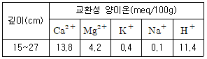 다음 표와 깊이에서의 교환성 양이온 농도를 측정하였다. 토양의 수소 및 염기 포화도(%)는?