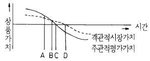 [폐기물개론] 시간에 따른 객관적 시장가치와 소비자의 주관적 평가 가치를 나타낸 그림에서 재이용 가치가 없는 완전한 폐기물로 발생 되는 시점은?
