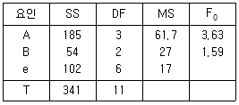 ② F0.90(3,6)=3.29 = 3.29이므로 귀무가설