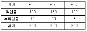 [실험계획법] 3대의 기계를 사용하여 각각 200개씩의 제품을 만든다고 했을 때 제품의 적합 여부를 실험한 결과가 다음 표와 같다. 적합품이면 0, 부적합품이면 1의 값을 주기로 하고, 위의 실험을 1원배치 실험과 똑같이 바꾸어 보면 인자 A는 수준수가 3인 기계이고, 각 수준에서의 반복은 200이 된다. 이와 같은 1원배치 실험을 실시했을 때의 기계간의 변동(SA)은 얼마인가?