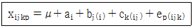 [실험계획법] 일반적으로 변량인자들에 대한 실험계획으로 많이 사용되며, 다음과 같은 데이터의 구조식을 갖는 실험계획법은? (단, i = 1, 2, … , l, j = 1, 2, … , m, k = 1, 2, … , n, p = 1, 2, … , r이다.)