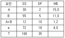 [실험계획법] 모수모형 2요인 실험의 분산분석을 실시한 결과 교호작용이 무시되었다. 오차항에 풀링한 후 요인 B의 분산비를 구하면 약 얼마인가?