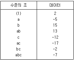 [실험계획법] 23 형 요인실험에서 수준의 조와 데이터는 다음과 같을 때, 요인 A의 주효과는?