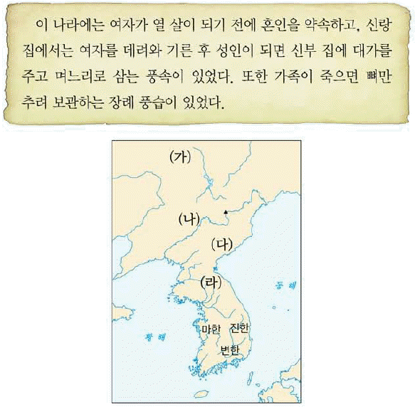 '이 나라에는 여자가 열 살이 되기 전에 혼인을 약속하고, 신랑 집에서는 여자를 데려와 기른 후 성인이 되면 신부 집에 대가를 주고 며느리로 삼는 풍속이 있었다'는 내용이 나와 있다. 이어 '또한 가족이 죽으면 뼈만 추려 보관하는 장례 풍습이 있었다'는 내용이 나와 있다. 이를 통해 첫 번째 것은 민며느리제이고, 두 번째 것은 골장제로 모두 초기 국가, 옥저의 풍습임을 알 수 있다.