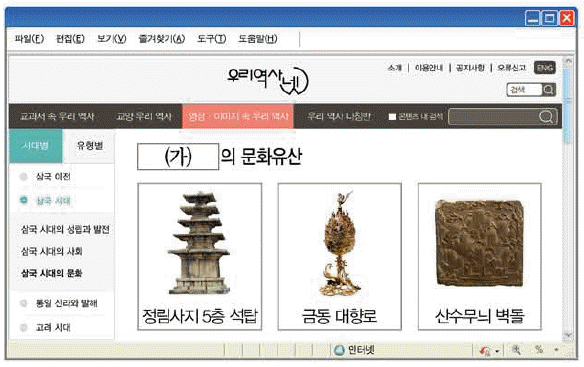 '(가)의 문화유산'으로 '(부여) 정림사지 5층 석탑, 금동 대향로, 산수무늬 벽돌'이 차례로 제시되어 있다. 모두 백제의 문화유산임을 알 수 있다.