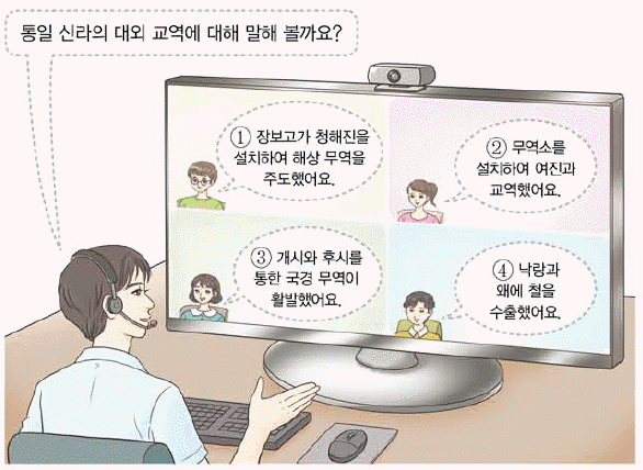 '통일 신라의 대외 교역에 대해 말해 볼까요'라는 교사의 질문이 제시되어 있다.