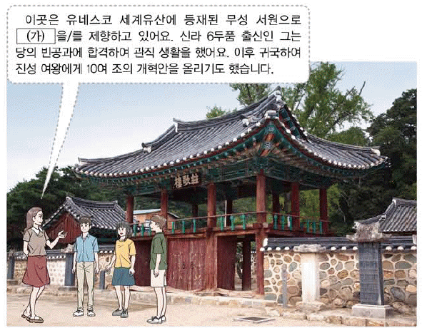 '이곳은 유네스코 세계유산에 등재된 무성 서원*으로 (가)을/를 제향하고 있다'는 내용이 나와 있다. 이어 '6두품 출신인 그는 당의 빈공과에 합격하고 관직 생활을 했으며 이후 귀국하여 진성 여왕에게 10여 조의 개혁안을 올리기도 했다'는 내용이 나와 있다. 이를 통해 제시된 '(가)'는 고운 최치원(857~?)을 가리키는 것임을 알 수 있다. 참고로 최치원이 신라로 귀국한 것은 헌강왕 11년인 885년이고, 시무 10여 조를 올린 것은 진성 여왕 8년인 894년의 일이다.