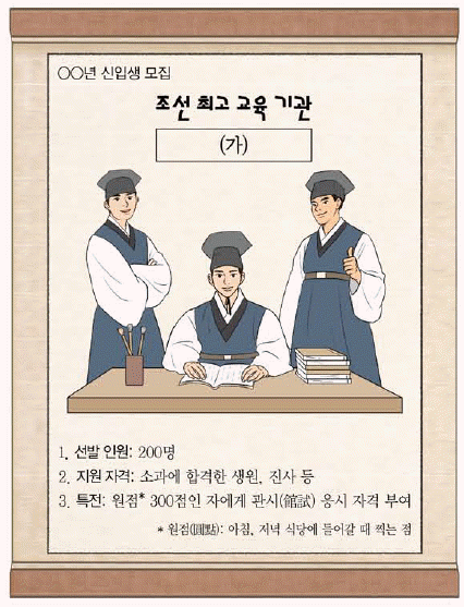'조선 최고 교육 기관 (가)'라는 제목하에 '선발 인원이 200명'이고, '지원 자격이 소과에 합격한 생원, 진사 등'으로 나와 있다. 이어 특전으로 '원점(圓點)* 300점인 자에게 관시(館試)** 응시 자격 부여'가 제시되어 있다. 이를 통해 제시된 '(가)'는 성균관임을 알 수 있다.