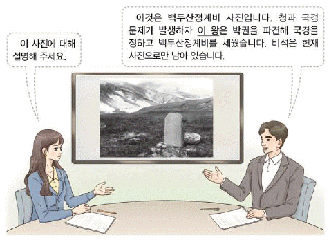 오른쪽 말풍선에 '이것은 백두산정계비 사진으로, 청과 국경 문제가 발생하자 이 왕은 박권을 파견해 국경을 정하고 백두산정계비를 세웠다'는 내용이 나와 있다. 이어 '비석은 현재 사진으로만 남아 있다'는 내용이 나와 있다. 이를 통해 제시된 자료 속 '이 왕'은 조선의 제19대 왕인 숙종(재위 1674-1720)임을 알 수 있다. 백두산정계비가 세워진 것은 숙종 38년인 1712년의 일이다.